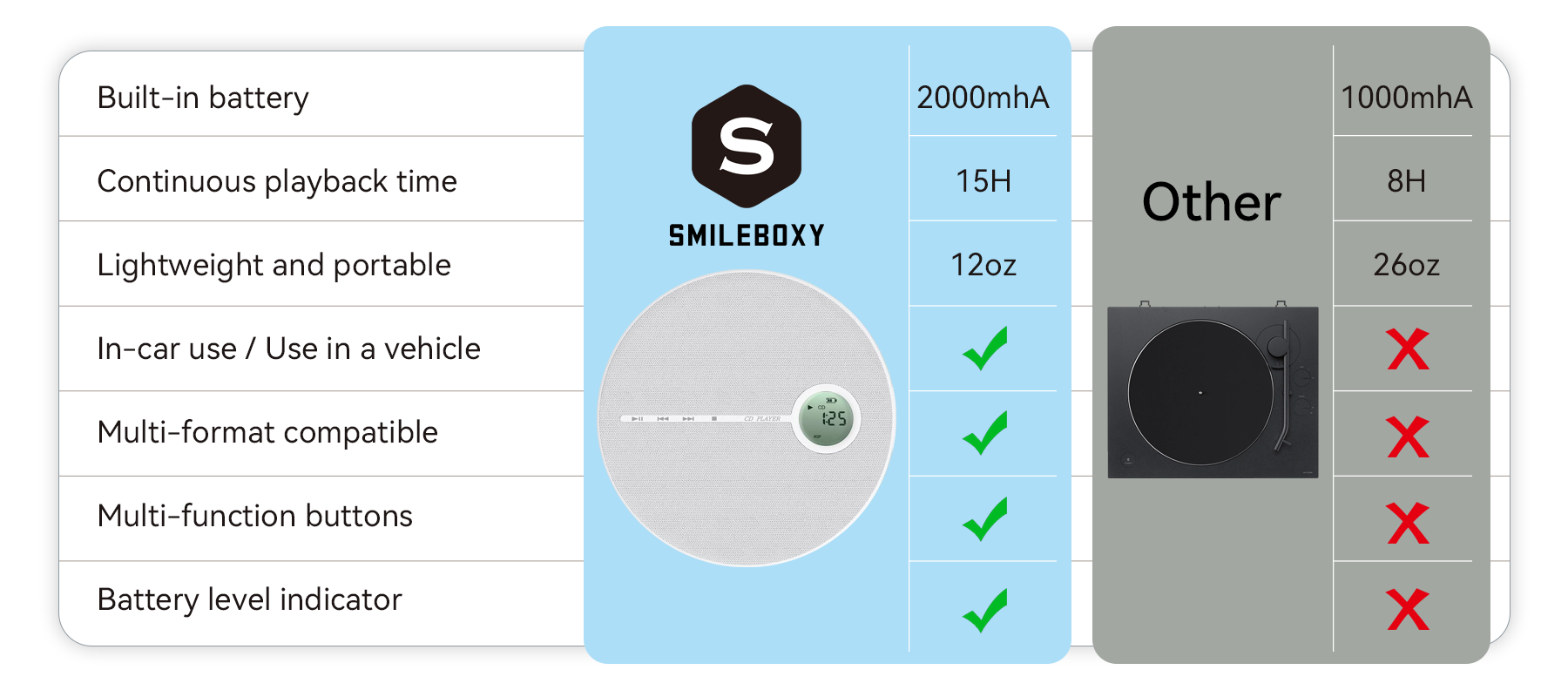 The Smileboxy CD player is compact and portable, making it easy to enjoy high-quality sound anytime, anywhere. Whether you’re traveling, commuting, or relaxing at home, it offers convenient music enjoyment wherever you go.