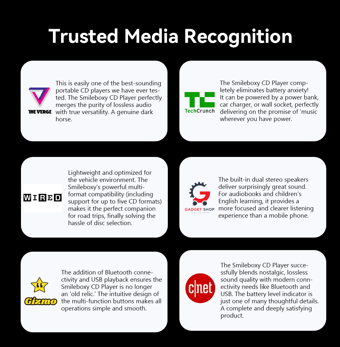 The Smileboxy CD player supports Bluetooth and USB playback, allowing you to enjoy high-quality sound in your car. Whether on a long road trip or a short commute, the anti-skip function ensures stable playback while driving, filling every journey with the joy of music.